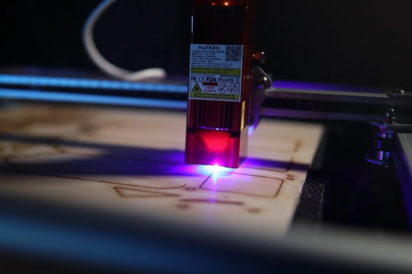Cutting depth of up to 12mm thick wood, 10mm acrylic, carving ceramics, and stainless steel can all be done with the latest Aufero AL2 5.5W high-compression focal point laser module diode.