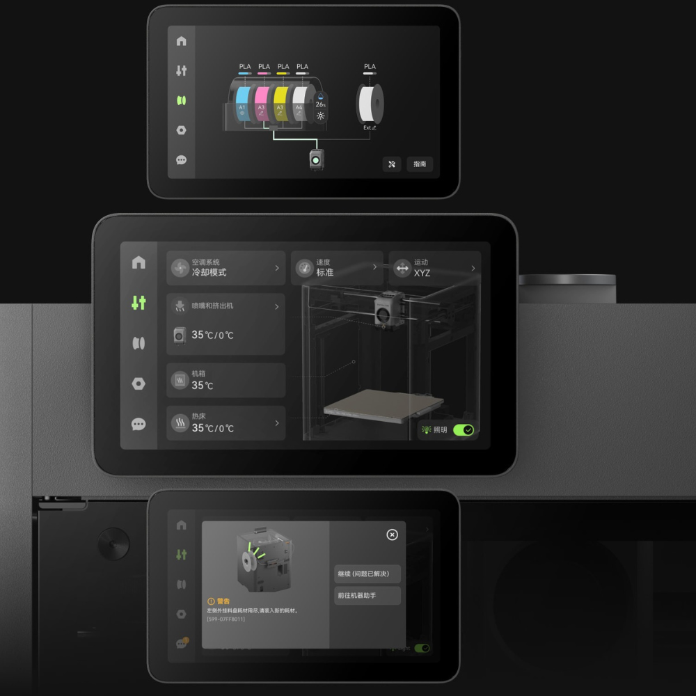 AI Error Detection: on-board computer vision monitors prints detects spaghetti nozzle blobbing and verifies start settings so you get fewer failed prints.