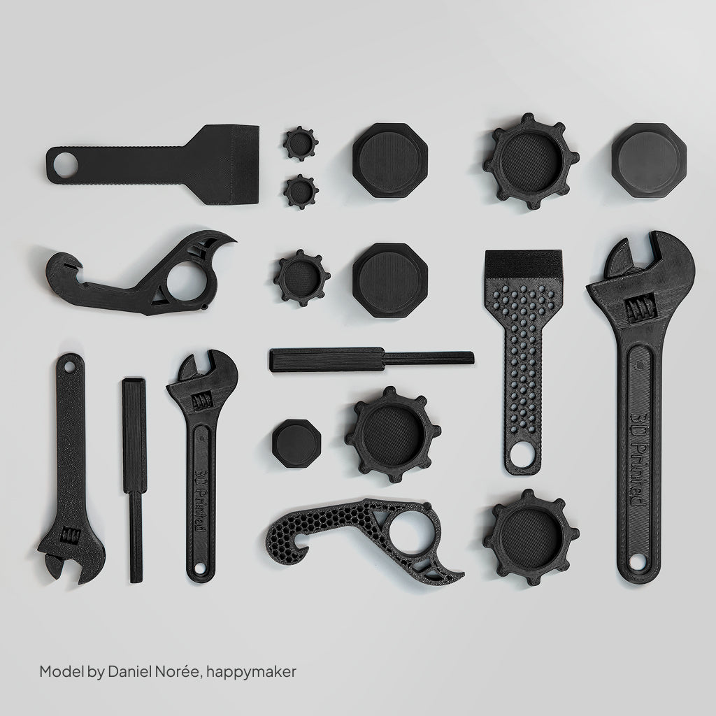 Hardened Steel Extrusion System: hardened steel nozzle and extruder gears are built for long term printing of abrasive fiber reinforced filaments.