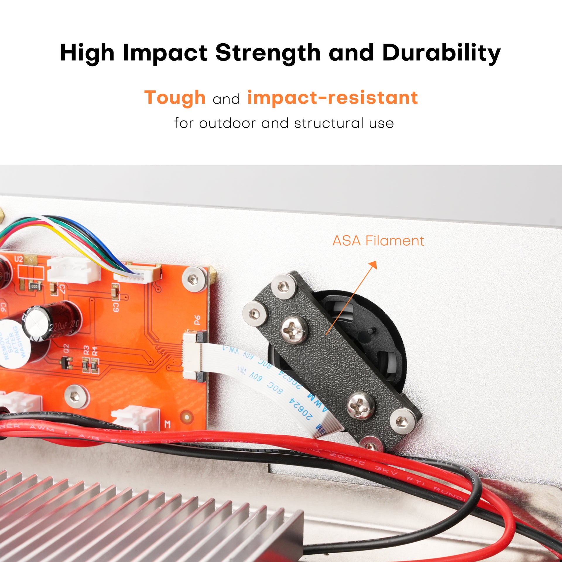 Mechanically, ASA tends to combine good impact resistance, toughness, rigidity, and relatively high strength, often described as similar to (or better than) older ABS filament, but with improved environmental/weather resistance.